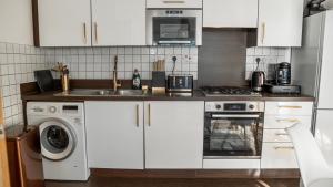 Accommodation comprises two bedrooms with three beds in total, complemented by a fully equipped kitchen that includes an oven, microwave, refrigerator, stovetop, toaster as well as tea and coffee making facilities and a dining table. The unit also provides a washing machine for convenience along with bed linen and towels supplied for guests' use.
