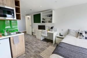 Das Apartment bietet ein separates Schlafzimmer mit einem Einzelbett sowie ein privates Badezimmer zur alleinigen Nutzung. Die Kochnische ermöglicht den Gästen die Zubereitung von Mahlzeiten und die Lagerung von Lebensmitteln während ihres Aufenthalts.