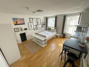 Das Nichtraucher-Apartment verfügt über ein Schlafzimmer mit einem Bett und Parkettboden sowie einen Sitzbereich und einen Schreibtisch für Komfort. Gästen steht eine voll ausgestattete Küche mit Kühlschrank, Mikrowelle, Toaster, Wasserkocher sowie Tee- und Kaffeezubereitungsmöglichkeiten zur Verfügung, Küchenutensilien und ein Esstisch sind ebenfalls vorhanden. Eine Waschmaschine und ein Kleiderschrank runden die Ausstattung ab.