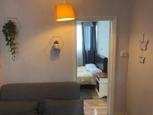 Accommodation features one bedroom with parquet flooring and heating, along with bed linen and towels provided for convenience. The full kitchen includes a refrigerator, microwave, toaster, electric kettle as well as all necessary utensils to prepare meals comfortably. A seating area complements the space with a sofa and flat-screen TV for entertainment purposes.