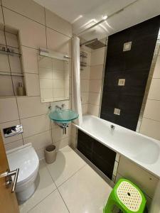 Accommodation comprises two separate bedrooms plus a living room with a sofa bed and seating area featuring a flat-screen TV. The kitchen comes complete with modern appliances such as a stovetop, refrigerator, microwave, toaster and electric kettle for preparing meals comfortably onsite. The bathroom includes both bathtub and shower options along with essentials like shampoo, body soap and hairdryer while linens and towels are provided.