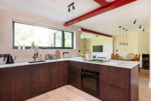 La sistemazione comprende tre camere da letto oltre a un soggiorno con TV e area salotto affacciata sul giardino. La cucina completamente attrezzata dispone di elettrodomestici moderni quali piano cottura, frigorifero, lavastoviglie, forno, microonde oltre ad angolo cottura con tostapane e macchinetta per tè e caffè complete degli utensili necessari per la comodità degli ospiti.