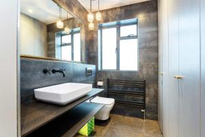 Accommodation comprises four beds across separate bedrooms, a living room with a television, and four bathrooms equipped with complimentary toiletries as well as bathtubs or showers. The fully fitted kitchen features an oven, dishwasher, refrigerator, microwave, toaster and complete kitchenware for self-catering needs. Additional room amenities include heating, ironing facilities with iron and board, towels provided for comfort, a washing machine and a seating area alongside wardrobe space.