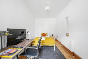 Accommodation comprises one bedroom and a living room furnished with two beds including a sofa bed, along with an equipped kitchen featuring an oven, stovetop, microwave, toaster, refrigerator, electric kettle and kitchenware for meal preparation. The bathroom contains a shower, bathtub or shower option, complimentary toiletries such as shampoo and conditioner, as well as a hairdryer. In-room extras include towels and bed linen, heating facilities, a washing machine, iron, clothes drying rack and non-feather pillows.