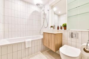 This spacious apartment comprises a living room plus three separate bedrooms with four beds in total, accompanied by three bathrooms fitted with bathtubs and showers. The fully equipped kitchen boasts modern appliances such as a stovetop, refrigerator, dishwasher, microwave and coffee machine along with kitchenware and dining facilities.